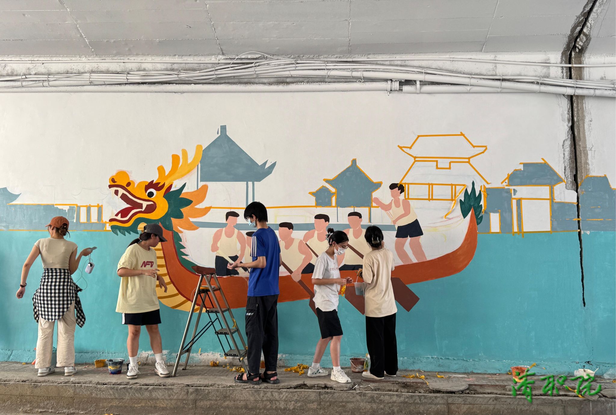 在为期一天的创作中,师生团队展现出精湛的专业素养。从测量墙面到构图打底,从调色上色到细节勾勒,师生们默契配合,将艺术创意转化为墙上的生动图景。桥下斑驳的老墙焕发新生:一幅作品以“绿色家园”为主题,光伏板点缀的农舍与劳作的村民相映成趣,展现乡村振兴的现代化图景;另一幅“龙舟竞渡”则生动再现当地传统民俗,鼓手激昂、桨手奋力的场景与岭南建筑相得益彰。这些作品不仅让冷清的墙面变身“会讲故事”的艺术长廊,更成为传播乡村文化的可视化载体。
