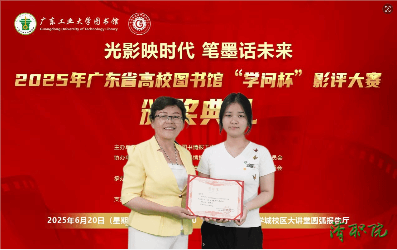 近日,2025年广东省高校图书馆“学问杯”影评大赛颁奖典礼在广东工业大学大学城校区大讲堂圆弧报告厅盛大举行。由学院图书馆馆长张伟珊指导的2023级数字媒体技术专业李雪玲同学,凭借作品《夺冠:精神之光的银幕礼赞》荣获优秀奖。