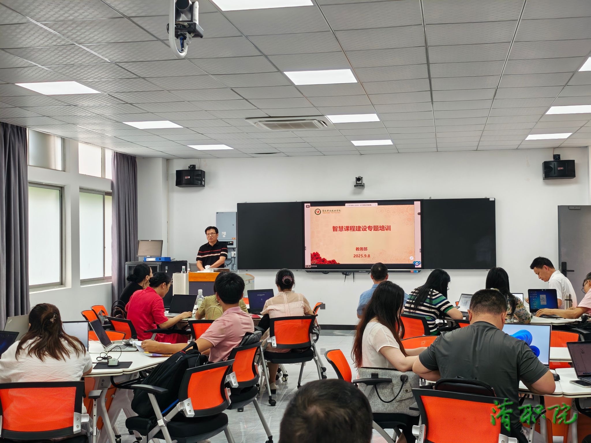 教务部部长谌俊在培训动员时指出,智慧课程建设是学校推进教育数字化战略行动的重要举措,希望全体教师主动拥抱智能教育技术,将培训成果转化为创新实践,切实提升课程质量与教学效能。他强调,一要深刻认识人工智能融入课堂教学的重要性和紧迫性;二是各二级教学单位应积极组织教师参与人工智能相关培训,不断提升信息化教学能力;三是做好课程遴选与提前布局,着力培育国家级精品课程和一流核心课程。