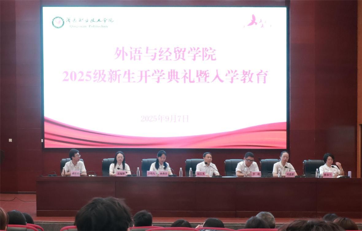 扬帆起航,逐梦未来——外语与经贸学院2025级新生开学典礼暨入学教育圆满举行2025年9月7日上午,外语与经贸学院(以下简称“外经贸”)隆重举行2025级新生开学典礼暨入学教育活动。外经贸班子成员、专业(教研室)主任、全体带班辅导员及全体2025级新生齐聚一堂,共同开启大学新篇章。典礼在庄严国歌声中启幕,全体师生肃立齐唱,尽显外经贸人昂扬风貌。外经贸党总支副书记林燕芬主持并致欢迎辞,简要介绍学院发展历程。教师代表李子豪“海阔凭鱼跃,天高任鸟飞”激励新生,勉励新生做好学业规划、积极参与实践,将专业与社会需求结合,争做实干兴邦的新时代青年。2024级学生代表余思烨从学习、生活等方面分享经验,鼓励新生主动成长、书写精彩。外经贸院长李政学院基本情况、办学成果与未来目标,围绕“学会做人、学会做事”寄语新生明确目标、深耕专业、掌握技能,做新时代中国特色社会主义接班人。外经贸党总支书记陆红光从适应环境、规矩意识等开展入学教育,强调安全纪律与入党启蒙,并讲授“挺膺担当”厚植新时代爱国主义情怀思政第一课,结合榜样事例阐释爱国主义内涵,鼓励同学坚定理想、将个人发展融入国家大局。典礼在校歌《扬起时代的风帆》中落幕,师生共同感悟“厚德、精技、致用、立业”的校训精神。愿2025级新生珍惜大学时光,善用学院资源与平台,成长为有理想、有本领、有担当的新时代外语经贸人才。